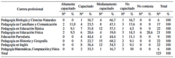 Continuando con el análisis por carrera, podemos afirmar que en la situación de Pedagogía en Matemáticas, Computación y Física, que representa el 4,8% (6 casos) del total de los casos estudiados, sostenemos que 33,3% (2 casos) de los estudiantes de la carrera plantean estar capacitado y 16,7% (3 casos) indica estar medianamente capacitado, de igual forma ninguno de ellos indica estar altamente capacitado, mientras que 50% (casos) de ellos manifiesta no estar capacitado.
