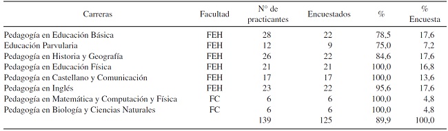 En la Tabla 1 es posible ver el número oficial de practicantes de pedagogía durante el segundo semestre del 2014, los que se encuentran distribuidos por carrera. Igualmente es posible observar el número y porcentaje de encuestas aplicadas distribuido por carrera.