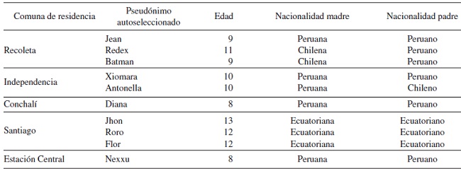 Los sujetos participantes de la muestra del estudio debían cumplir con criterios establecidos por la investigación. Este tipo de muestra se denomina intencionada u opinática-estratégica (Valle 2003). Los criterios eran: ser niñas, niños y adolescentes de entre 8 a 17 años de edad, hijas e hijos nacidos en Chile de madres y padres migrantes. El principal criterio de exclusión era el lugar de nacimiento, porque el objetivo del estudio era, justamente, analizar a esta población (sobre niñas y niños migrantes nacidos en sus países de origen ya hemos investigado anteriormente, por ejemplo, ver Pavez-Soto 2012, 2017a; Poblete y Galaz 2016). El número de casos fue de 10, debido a que era un estudio intensivo de datos y acotado.