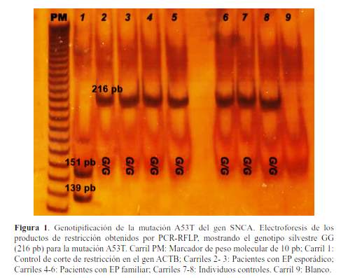 No se encontró la mutación A53T en las 73 muestras analizadas, correspondiente a los tres grupos: EP esporádico, EP familiar y controles como se muestra en la figura 1.