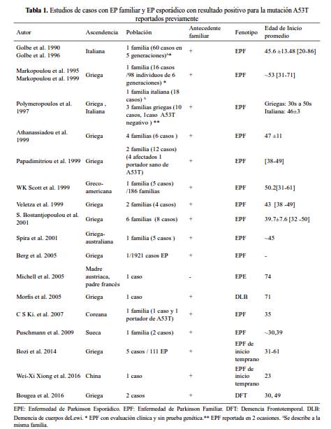 En 1997 se identificóla mutación A53T en el gen SNCA en una extensa familia de origen ítalo-griego con múltiples casos de EP, conocida como “Contursi Kindred”, siendo identificada en otras familias de la misma región (4). Esta mutación , asociada a una forma autosómica dominante de EP, es la sustitución de un residuo de alanina por treonina en el codón 53 del gen SNCA(5). La mutación A53T-SNCA se ha detectado principalmente en casos de EP familiar, en su mayoría relacionados a las primeras familias griegas identificadas y en algunos casos de EP esporádico(6,7,8).