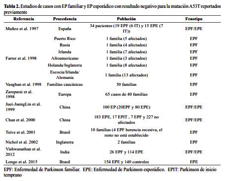 La mutación A53T es poco frecuente en poblaciones de ascendencia distinta a la griega e italiana. Aunque esta mutación ha sido descrita también en cuatro familias no relacionadas en Suecia, Corea, China y Polonia, los estudios de haplotipos realizados en las familias sueca y coreana sugieren posibles mutaciones denovo (6-8,15). La frecuencia de esta variante es muy baja (1/1921) en población de EP esporádico de origen caucásico(16). Otros estudios de grandes cohortes de casos EP esporádico y familiar en poblaciones caucásicas, asiáticas y afroamericanas no encontraron otros casos de EP asociados a la mutación A53T (tabla 2). En Latinoamérica, estudios realizados en casos de Brasil y en una familia de ascendencia portorriqueña no se encontró esta mutación (17,18,19). Estos hallazgos sugieren que la mayoría de casos de EP asociado a la mutación A53T estarían vinculado a un efecto fundador asociado a las familias griegas e italianas; mientras que los pocos casos descritos en otras regiones del mundo corresponderían a mutaciones de novo. En los casos analizados, la ausencia de la mutación A53T podría ser explicada, al menos en parte, por la composición mestiza de nuestra población que tiene un alto porcentaje de componente amerindio (20); sin embargo, no podemos excluir la intervención de otros factores genéticos y ambientales que no han sido considerados en este estudio.