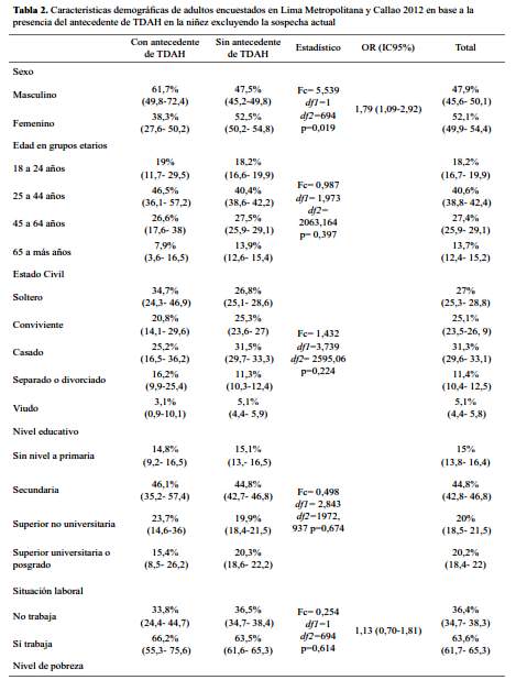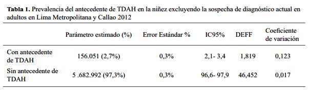 Es un estudio descriptivo de corte transversal, se usó la base de datos del “Estudio epidemiológico de salud mental en Lima Metropolitana y Callao” realizado por el Instituto Nacional de Salud Mental “Honorio Delgado-Hideyo Noguchi” en el año 2012 (EESMLMC-2012). La muestra final de adultos estuvo compuesta por 4445 encuestados. Los instrumentos utilizados en el Estudio Epidemiológico de Salud Mental en Lima Metropolitana y Callao-2012 (EEDMLMC-2012) fueron sometidos a ensayos pilotos y grupos focales siguiendo el mismo procedimiento de estudios epidemiológicos anteriores (13). Las preguntas del presente estudio se obtuvieron en base al M.I.N.I PLUS (Mini International Neurophysquiatric Interview v. en español 5.0) (14) con modificación posterior para los criterios del DSM-5 (15). Se definió como adulto con antecedente de TDAH en la niñez sin sospecha actual del trastorno, aquel que cumplió criterios de TDAH en la niñez y que resultara negativo ante el cuestionario auto informado de cribado del TDAH del adulto- V1.1 (ASRS-V1.1) (16).