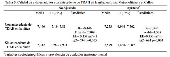 Con respecto al análisis con el modelo lineal general, se halló una correlación negativa entre la presencia del antecedente de TDAH y la calidad de vida, controlando con el efecto de las variables sociodemográficas y la prevalencia de cualquier trastorno mental actual (B=-0,326; p=0,034). Se obtuvo que la calidad de vida promedio cuando se tiene el antecedente de TDAH es de 7,253 (IC95% 6,994 -7,562) en comparación con 7,579 (IC95% 7,468-7,689) cuando no se presenta este antecedente (tabla 3).