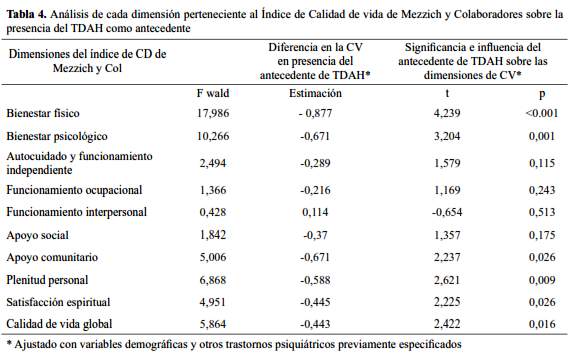 Se analizó las diez dimensiones de calidad de vida y su relación con el antecedente de TDAH en la infancia. Se encontró que cada dimensión influye de forma distinta cuando hay y no hay presencia de TDAH. Las dimensiones de bienestar físico (B=0,877; p=<0,0001), bienestar psicológico (B= -0,671; p=0,0001), apoyo comunitario (B=-0,671;p=0,026), plenitud personal (B= -0,588; p=0,009), satisfacción espiritual (B= -0,445; p=0,026) y calidad de vida global (B= -0,443; p=<0,016) se correlacionan negativamente con el antecedente de TDAH, siendo el bienestar físico, el que otorga mayor cambio. No se encontró asociaciones estadísticamente significativas con: Autocuidado y funcionamiento independiente (B=-0,289; p=0,115), funcionamiento interpersonal(B=0,114; p=0,513), funcionamiento ocupacional (B=-0,216; p=0,243) y apoyo social (B=-0,37; p=0,175) (tabla 4).
