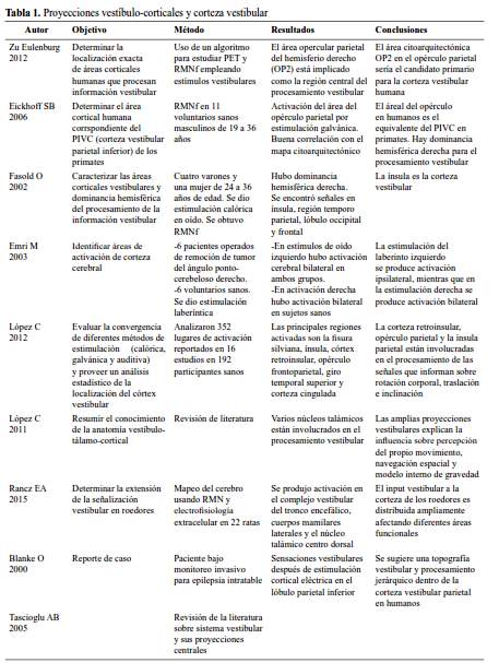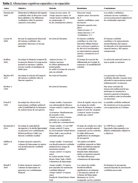 Como se ha descrito anteriormente el sistema vestibular no solo tiene como funciones estabilizar la mirada y mantener el balance postural sino que también participa en cognición espacial, representación corporal y procesos afectivos (32,33), aunque también algunos procesos cognitivos no espaciales también se ven afectados (34) (tabla 2).