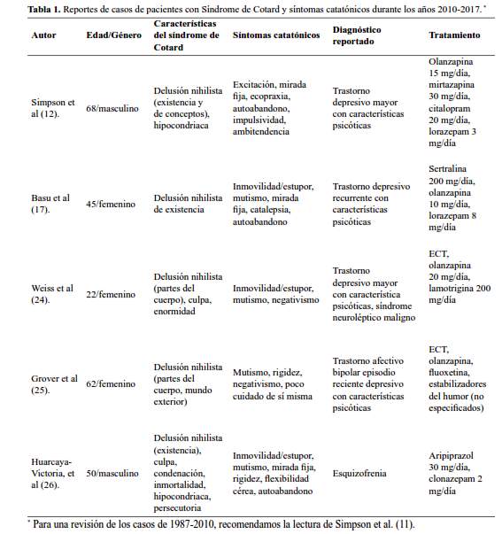 La psicopatología de este síndrome excede por mucho la asociación única con las delusiones nihilistas que se ha venido realizando en los últimos años, ya que además podemos encontrar delusiones de inmortalidad, enormidad, culpa, posesión y persecución. Las delusiones de inmortalidad y culpa pueden verse característicamente en el síndrome de Cotard, las demás delusiones podrían ser propias del cuadro de depresión psicótica. Se encuentra, además, alteraciones del afecto, voluntad y sistema motor. En nuestro paciente, además encontramos clínica catatónica. Debemos recordar que la catatonía no es de presentación infrecuente en la práctica clínica psiquiátrica; sus síntomas y signos, tal como sucedió con nuestro paciente, son fácilmente reconocibles. Los reportes de caso de asociación entre el síndrome de Cotard y la catatonía son escasos (tabla 1); para algunos autores esto se debería a lo raro de esta asociación (17), para otros, los síntomas catatónicos serían más prevalentes que lo reportado (12). Esto pudiera explicarse, en parte, debido a que los síntomas catatónicos son comúnmente infradiagnosticados por ser poco explorados, lo que podría llevar, en el peor de los casos, a un tratamiento ineficaz, resultando en complicaciones serias para la vida del paciente debido a la prolongada inmovilidad y deshidratación producto de la catatonía.