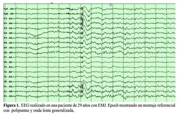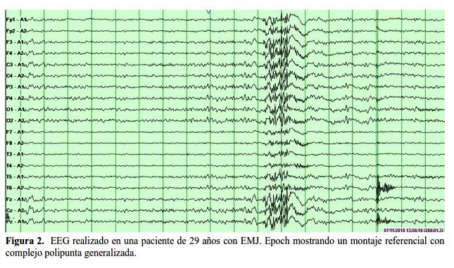 El diagnóstico de la EMJ es electro-clínico, basado en la presencia de las características clínicas ya mencionadas. El electroencefalograma (EEG) provee un apoyo; en el EEG, la EMJ típicamente presenta un ritmo de fondo dentro de los límites de la normalidad (6). El hallazgo interictal incluye descarga de puntas y complejos punta-ondas generalizados y poli puntas- y-ondas, la frecuencia puede ser hasta de 6Hz y de dominio frontocentral (figura 1 y figura 2) (13).