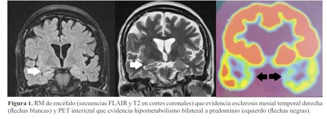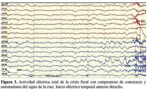 Mujer de 42 años, diestra, católica, secretaria de parroquia desde los 30 años, previo a ello no se consideraba ferviente devota. Su desarrollo psicomotor y escolaridad fueron normales. Tiene epilepsia focal farmacorresistente, con edad de inicio a los 9 años. De los 9 a 16 años escasas crisis focales de parada comportamental de 1 minuto, sin más detalle en el relato. Desde los 32 años, crisis focales con compromiso de conciencia: aura de “sensación de extrañeza” y autosautoscopía; seguidas de parada comportamental con automatismos orales y manuales simples. En algunas crisis repite “tengo que rezar” o “tengo que limpiar”. Las crisis son diurnas en vigilia y la frecuencia es de 5/mes. Ha recibido Fenitoína y Carbamazepina sin éxito. Esquema actual: Valproato 2 g/ día y Levetiracetam 3 g /día. La paciente ingresó a la Unidad de Epilepsia del Hospital Rebagiati para evaluación prequirúrgica de cirugía de epilepsia. El examen neurológico fue normal, la resonancia (RM) de encéfalo evidenció: Esclerosis mesial temporal derecha (figura 1). La evaluación neuropsicológica evidenció: CI normal y compromiso mnésico verbal y no verbal en 60%. Se realizó un Video-EEG de 173 horas que evidenció: escasa actividad epileptiforme interictal temporal anterior derecha y se registraron 3 crisis; 2 diurnas durante vigilia con semiología similar a la descrita en la anamnesis: aura, seguida de parada comportamental, automatismos orales, automatismos manuales bilaterales y confusión postictal. El EEG ictal evidenció inicio temporal anterior izquierdo. Durante el sueño nocturno (NREM-N2) se registró una tercera crisis que inició con despertar, seguido de parada comportamental con breves automatismos bimanuales y automatismo gestual consistente en acto de persignarse en forma repetitiva por 3 veces con la mano derecha, seguido de automatismos orales prominentes; en el postictal continuó con el sueño (figura 2). El EEG de la tercera crisis evidenció actividad epileptiforme ictal de inicio temporal anterior derecho (figura 3). La tomografía por emisión de positrones (PET) interictal evidenció hipometabolismo bitemporal a predominio izquierdo (figura 1). Se diagnosticó epilepsia del lóbulo temporal mesial bilateral con probables focos independientes y esclerosis mesial temporal. La paciente espera colocación de estimulador del nervio vago.