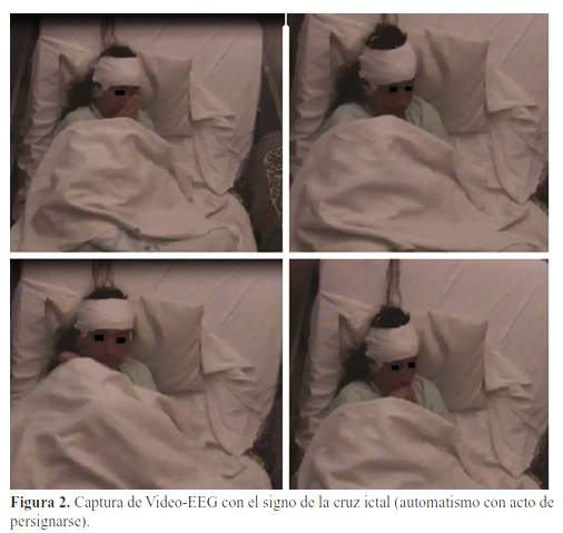 Los automatismos epilépticos se clasifican como perseverativos cuando son la continuación de un acto motor intencional previo a la crisis o de novo cuando surgen con o después del inicio ictal (5,9). Se ha discutido si el signo de la cruz podría preceder al inicio ictal y por tanto ser un acto voluntario como una reacción fisiológica al miedo de que se avecina una crisis. Sin embargo, en todos los casos previamente descritos, así como en nuestro caso, se ha presentado una vez iniciado el compromiso de conciencia; por lo que la posibilidad de ser simplemente una reacción al temor de iniciar una crisis se ha descartado y se considera un automatismo de novo (9).