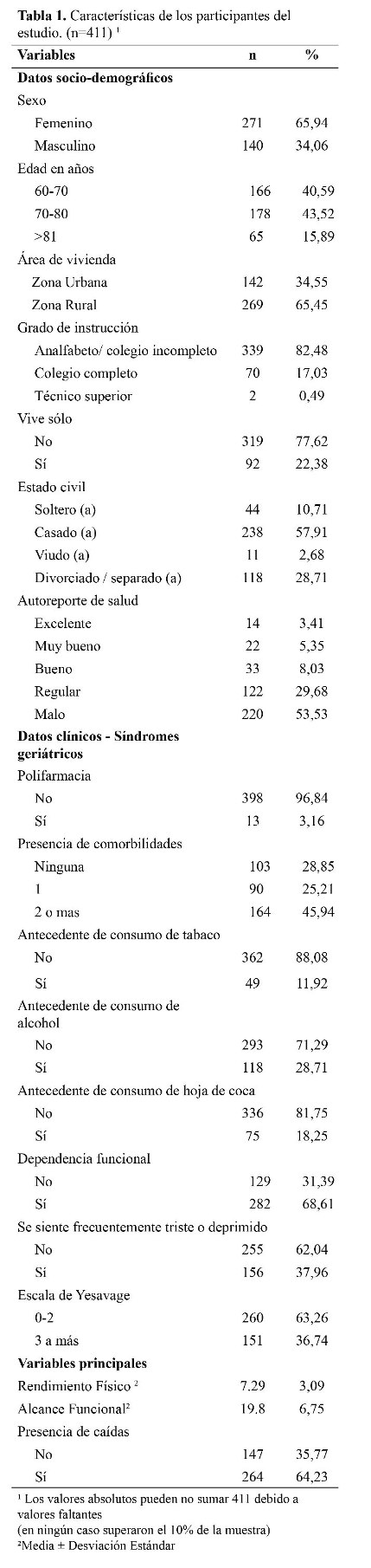 Se encontró una frecuencia de población femenina del 65,94% (271 entrevistadas), en cuanto al grupo etario la mayoría de participantes tenían una edad entre los 70 a 80 años de edad (43,52%). La mayor parte (65,45%) vivía en una zona rural y el 82,48% eran analfabetos o tenían el colegio incompleto. El 77,62% vivía en compañía de alguien. La mayoría de participantes eran casados al momento de la aplicación del instrumento (57,91%) seguido de divorciados/separados (28,71%) solteros (10,71%) y viudos (2,68%). Al preguntárseles acerca de cómo consideraban su estado de salud la mayoría (53,53%) lo consideraba como malo, seguido por regular en un 29,68%.