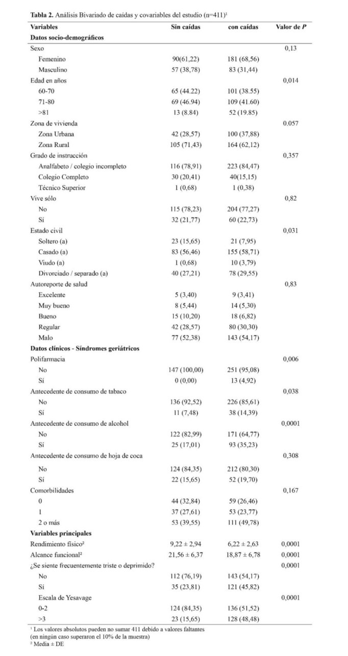 La tabla 2 muestra un análisis bivariado de caídas y covariables del estudio. Vemos que la mayoría de participantes con caídas fueron de sexo femenino (68,56%) pero sin ser un dato estadísticamente significativo, en cuanto a edad el grupo etario con mayor porcentaje de caídas (41,60%) fueron entre 71 a 80 años con datos estadísticamente significativo. Por otra parte, al hablar de estado civil, se vio en el grupo de participantes viudos que el 3,79% habían sufrido caídas en comparación al 0,68% que no tenían historial de caídas en los últimos 12 meses, con datos estadísticamente significativos.