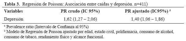 En la tabla 3 se muestra la asociación entre caídas y depresión mediante la regresión de Poisson en el cual se evidencia un PR crudo (con intervalo de confianza en 95%) de 1,62 y un PR ajustado de 1,40.