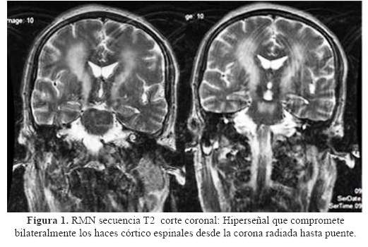 Al examen clínico paciente despierto, desorientado en tiempo y lugar, facies inexpresiva, afásico, no obedecía órdenes simples, presentó signos de liberación frontal (imitación, coleccionismo, prensión palmar, reflejo palmomentoniano y de succión), disminución del reflejo nauseoso con úvula central y velos simétricos, cuadriparesia espástica simétrica a predominio de miembros inferiores, Babinski bilateral y reflejos osteotendinosos conservados. No se evidenció fasciculaciones, ni atrofia muscular, la sensibilidad no fue evaluable.