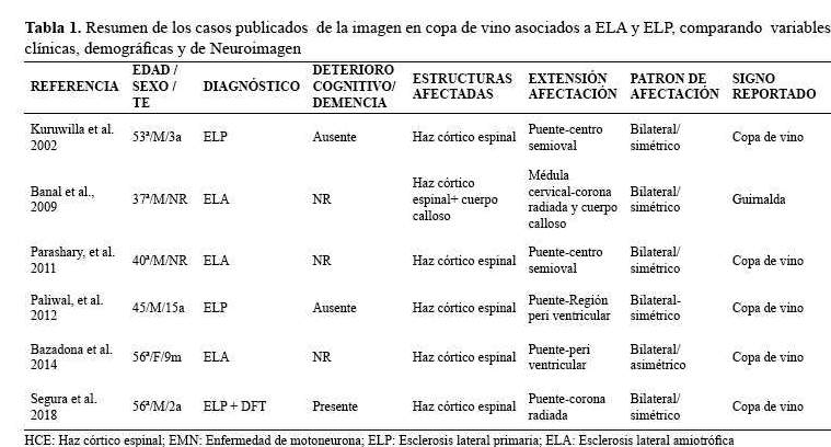 Kuruvilla et al., y Paliwal et al., en el 2012 comunicaron por primera vez la descripción en RMN de la imagen en copa de vino por afectación bilateral, simétrica y lineal de los haces corticoespinales observada en cortes coronales, ambos reportes se hicieron en pacientes con diagnóstico de ELP sin déficit cognitivo (1,12). A diferencia de los casos reportados por estos autores nuestro paciente presentó un cuadro compatible con demencia frontotemporal asociada (tabla 1).