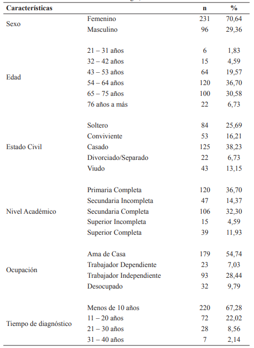 El tipo de muestreo fue no probabilístico por conveniencia. Se acudió al consultorio externo del servicio de endocrinología, de lunes a sábados en dos turnos (mañana y tarde), durante el mes de febrero del 2019. Previa firma de consentimiento informado, fueron entrevistados 337 pacientes con diagnósticos de DM2 verificados en sus historias clínicas. Del total de encuestas completadas, 10 presentaron incongruencias en el llenado tales como datos faltantes, marcar 2 alternativas a la vez, y similares; por lo que fueron descartadas, con lo que se evaluaron 327, siendo esta la muestra total.
