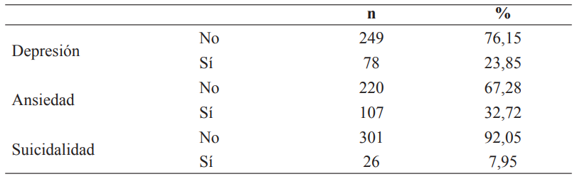 Las características socio-demográficas de la población estudiada se pueden apreciar en la tabla 1. De la muestra estudiada se encontró que el 23,85% presentaron depresión, el 32,72% ansiedad y el 7,95% suicidalidad (tabla 2); así mismo, el 5,5% presentaron síntomas de depresión y de ansiedad (tabla 3).