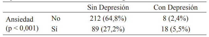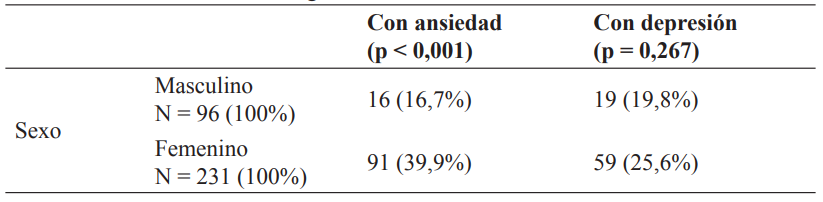 En relación al sexo, se encontró que los pacientes de sexo femenino presentaron mayor frecuencia de ansiedad, llegando al 39,9% versus 16,7% (p < 0,01). No hubo diferencias con respecto a la depresión (tabla 4).