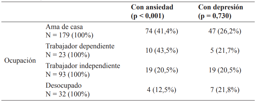 En cuanto a la ocupación, se determinó que los trabajadores dependientes presentaron más ansiedad, la que correspondía al 43,47% (p < 0,01) (tabla 5).