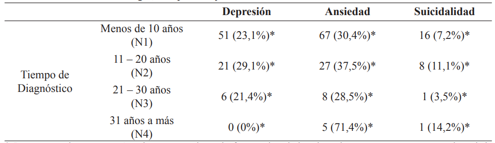 Se encontró que el grupo con tiempo de diagnóstico de 11 a 20 años fue el que presentó mayor frecuencia de depresión; sin embargo, el grupo de 31 años a más presentaron mayor frecuencia de ansiedad y suicidalidad (tabla 6).