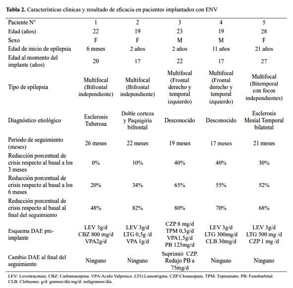 En nuestra base de datos, de 122 pacientes evaluados para posibilidad de cirugía de epilepsia, encontramos 6 pacientes con epilepsia focal farmacorresistente, quienes no fueron candidatos a cirugía resectiva de epilepsia y a quienes se les implantó el estimulador del nervio vago. En los 6 pacientes, el monitoreo prolongado con Video-Electroencefalograma de superficie identificó más de una zona epileptógena (epilepsia multifocal). Para catalogar que el paciente presentaba más de un foco epileptógeno, fue requisito que cada foco epileptógeno tuviese su propia semiología y su propia actividad eléctrica ictal. Debido a los altos costos del ENV, los criterios para decidir el implante en adultos, en nuestro centro los hemos restringido a pacientes con epilepsia multifocal, no candidatos a cirugía resectiva de epilepsia y algunos casos seleccionados en quienes la zona epileptógena (ZE) asiente en una zona elocuente. Por esta razón y al ser la evidencia más débil para epilepsias generalizadas y combinadas refractarias como el síndrome del Lennox Gastaut; en estos casos priorizamos la callosotomía frente al ENV. De los 6 pacientes, se excluyó a una paciente por tener un periodo de implante menor a un mes.