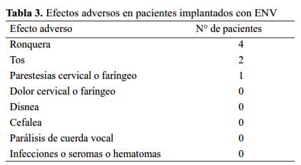 Respecto a los efectos adversos, de la misma forma que hemos encontrado en nuestra serie, los estudios de seguimiento a corto y largo plazo, coinciden en un adecuado perfil de seguridad del ENV. Los riesgos de este procedimiento, que es poco invasivo y reversible; son habitualmente menores, autolimitados (fenómeno de habituación), bien tolerados por el paciente, no requieren modificaciones significativas en los parámetros de estimulación y no son causal de retiro del dispositivo en la gran mayoría de casos. En forma homogénea y de forma similar a nuestros resultados, el efecto adverso más frecuente encontrado en otros estudios, es el cambio en el tono de voz (ronquera o disfonía). Este se reporta entre un 37 a 84% de los pacientes implantados y en los estudios EO3 y EO5 fue significativamente mayor en el grupo de estimulación terapéutica que el grupo con estimulación subterapéutica. Otros eventos adversos de escasa severidad, incluyen a la tos y parestesias cervicales o faríngeas que las evidenciamos en tres de nuestros pacientes y fueron transitorias al iniciar el periodo de rampa y solo durante la estimulación (periodos "on"). La tos ha sido reportada en 11 a 45% de pacientes y las parestesias en 6 a 25%. En nuestro estudio no encontramos otros efectos adversos menores, ni tampoco efectos adversos serios como parálisis de cuerda vocal, fractura del cable del electrodo, hematomas, seromas o infecciones en el entorno del estimulador. En otros estudios se han reportado disnea entre 6 a 25%, cefalea entre 5 a 24%, náuseas entre 7 a 20% y dolor cervical – faríngeo entre 11 a 25%. Son raras las complicaciones serias antes referidas, que ocasionalmente pueden obligar a que los generadores sean inactivados transitoriamente o explantados (15,16,18,20,22,24,29,31)