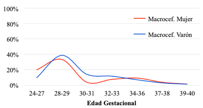 La edad gestacional analizada desde las 24 semanas hasta las 40 semanas. La incidencia de macrocefalia en los niños a término fue de 1.8%, y en los prematuros de 9.2%. Por grupos de prematuros, se encontró 17,1% entre las 28-31 semanas y de 14,6% entre los de 24 semanas y menores de 28 semanas.