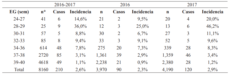 La tabla 1 muestra que la incidencia de macrocefalia en el 2017 fue de 2,9% aumentando un 0.6% con respecto al 2016. Estas tasas de incidencia, se encontraron en relación inversa a la edad gestacional.