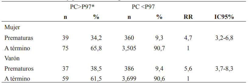 En la tabla 2, se observa que en el grupo de mujeres con macrocefalia (PC>P97) el 34,2% son prematuras, en cambio en el grupo de mujeres sin macrocefalia son prematuras el 9,3%, siendo esta diferencia porcentual significativa (p<0,001); un resultado similar se observó en el grupo de varones.