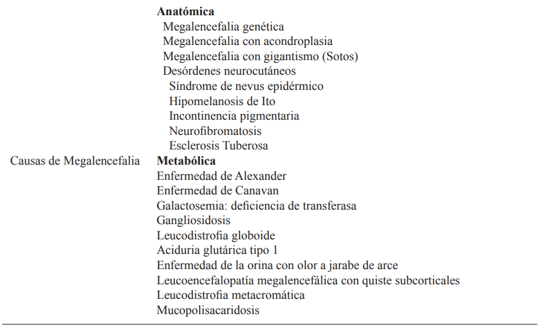 Si ninguno de los padres tiene un perímetro craneal ≥ 98% o si existe aumento de la velocidad del crecimiento craneal es importante descartar hidrocefalia primaria o secundaria. Y cuando el infante presente retraso del desarrollo, epilepsia, rasgos dismórficos o estigmas neurocutáneos cabe sospechar que el encéfalo es grande (megalencefalia) y anormal (tabla 3). En estos casos, la hidrocefalia rápidamente se puede descartar haciendo una ecografía cerebral, que se prefiere para evitar la radiación de la tomografía, de confirmarse la hidrocefalia se podría realizar una resonancia magnética para definir el nivel de obstrucción y las lesiones asociadas. De tratarse de megalencefalia las causas subyacentes son muy variadas y deberá iniciarse un proceso diagnóstico al respecto (6,7,8).