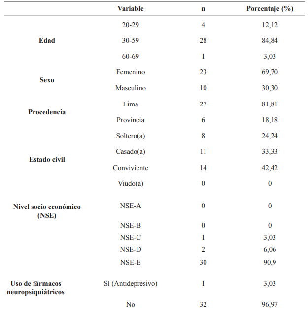 Se invitó a participar a 35 cuidadores, de los cuales 33 (94,28%) aceptaron y firmaron el consentimiento informado. La tabla 1 proporciona las características sociodemográficas y uso de fármacos neuropsiquiátricos de los cuidadores enrolados. El 84,84% tenían entre 30 y 59, años y la mediana de edad fue 39 años (RIQ= 9,52). La mayoría (69,7% n=23) de cuidadores fueron del sexo femenino, procedentes de Lima (81,81% n=27), y convivientes (42,42% n=14); y el 90,9% (n=30) de cuidadores pertenecían al nivel socio económico E. Un cuidador (3,03%) reportó tomar antidepresivos.
