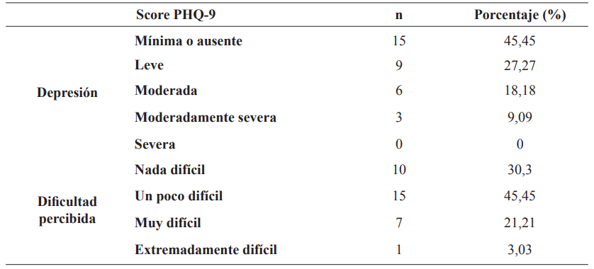 Los resultados del cuestionario PHQ-9 están presentados en la tabla 2. Ningún cuidador presentó depresión severa; el 9,09% (n=3) presentaron depresión moderadamente severa; el 18,18% (n=6) depresión moderada; el 27,27% (n=9) depresión leve, y el 45,45% (n=15) depresión mínima o ausente. El 45,45% (n=15) refirieron dificultad leve en el trabajo, labores domésticas y en sus relaciones interpersonales como consecuencia de los síntomas depresivos, el 21,21% (n=7) dificultad moderada y solo el 3,03% (n=1) dificultad severa.