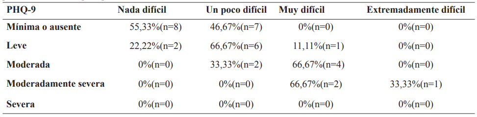 La tabla 3 proporciona la relación entre el cuestionario PHQ-9 y la dificultad en el trabajo, labores domésticas y relaciones interpersonales de los participantes De los participantes con depresión moderada, el 33,33% (n=2) refirieron poca dificultad, y el 66,67% (n=4) mucha dificultad. Por último, de los pacientes que presentaron depresión moderadamente severa, el 66,67% (n=2) respondieron que tenían mucha dificultad, y el 33,37% extrema dificultad.