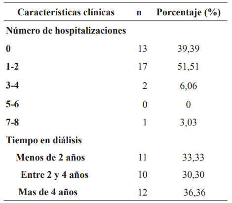 La tabla 4 contiene las características clínicas de los pacientes pediátricos en diálisis; más de la mitad de los pacientes (51,51%, n=17) fueron hospitalizados de 1 a 2 veces en el último año. El 33,33% (n=12) de los pacientes llevan menos de 2 años en terapia de reemplazo renal, el 30,3% (n=10) entre 2 y 4 años, y el 36,3% (n=12) más de 4 años. El tiempo en diálisis mínimo fue de 3 meses y el tiempo máximo de 110 meses.