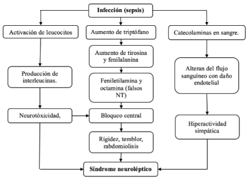 Las altas concentraciones de tirosina y fenilalanina en cerebros de pacientes sépticos se ha demostrado causa incremento de sus productos de degradación entre los que se encuentran b-feniletilamina y octopamina, siendo neurotransmisores falsos en la inhibición del sistema noradrenérgico y dopaminérgico (12), relacionándose finalmente como un estimulador cerebral con inhibición del sistema dopaminergico induciendo o facilitando la cadena fisiopatológica del SNM.