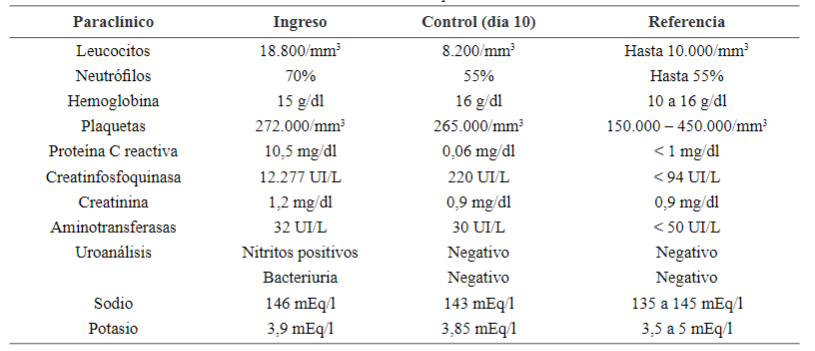 Refería antecedente de trastorno afectivo bipolar (TAB) con síntomas psicóticos por lo que una semana antes se había iniciado manejo con risperidona 2 mg cada 12 horas y ácido valproico 250 mg cada 12 horas. Al examen físico los signos vitales con frecuencia cardiaca 120 lpm, presión arterial 125/82 mmHg, frecuencia respiratoria 23 rpm con saturación de 90%, temperatura 39,1°, se tornaba diaforética, somnolienta, con dificultad para caminar por rigidez muscular generalizada, signo de rueda dentada, temblor fino lingual y de manos. Se suspendió la risperidona, se instauró tratamiento con líquidos endovenosos, midazolam 2 mg cada 12 horas intramuscular, bromocriptina 2,5 mg cada 8 horas y se solicitaron paraclínicos (tabla 1).