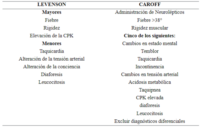 En el caso presentado se cumplían con los criterios diagnósticos mayores y algunos menores, indicando así la presencia de síndrome neuroléptico maligno con los criterios de Levenson y los de Caroff.
