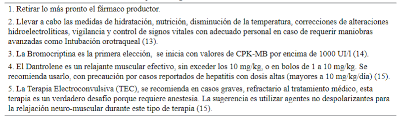 El SNM se caracteriza por ser un trastorno agudo de la termorregulación, del control neuromotor y disautonomías (9), el cual se debe diferenciar de otras patologías como la hipertermia maligna, catatonia letal, síndrome colinérgico central, síndrome serotoninérgico, entre otros (10); Por lo que recomienda el uso de los criterios diagnósticos del SNM (tabla 2), que tienen una sensibilidad de 87 a 93% y especificidad cercana al 95% (6,11,12).