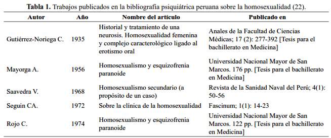 Respecto a la génesis de la homosexualidad, Delgado mencionó que se debería a tres factores fundamentales: 1) los caracteres sexuales somáticos, es decir, el hermafroditismo físico; 2) los caracteres sexuales psíquicos, la actitud femenina en el varón y viceversa; y 3) la clase de elección del objeto sexual, o sea, optar por sujetos del propio sexo (12). El tratamiento era variado: régimen fisioterápico o gimnástico, hormonal, quirúrgico, cura psicoterapéutica desde la simple sugestión hasta el análisis proseguido por años (21). Aparte de los trabajos generales de Delgado sobre la vida instintiva, la sexualidad y sus desviaciones, llama la atención que, en la bibliografía psiquiátrica peruana, hayan sido pocos los médicos que estudiaron específicamente la homosexualidad (tabla 1) (22).