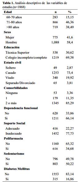 Material and Methods: Analytical, retrospective, and secondary database study of investigations carried out between 2010 and 2015 in a population of 1,896 older adults, attended in the Geriatric service of the Naval Medical Center, the main hospital of the Peruvian Navy.
