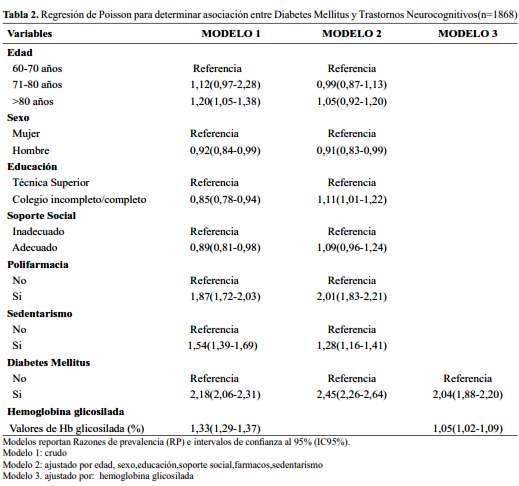 Conclusions: A relationship was found between DM and neurocognitive disorders. Being male seems to be a protective factor against cognitive decline. Hyperglycemia causes cognitive impairment, with glycosylated hemoglobin being a determinant test in the assessment of older diabetics with cognitive problems.