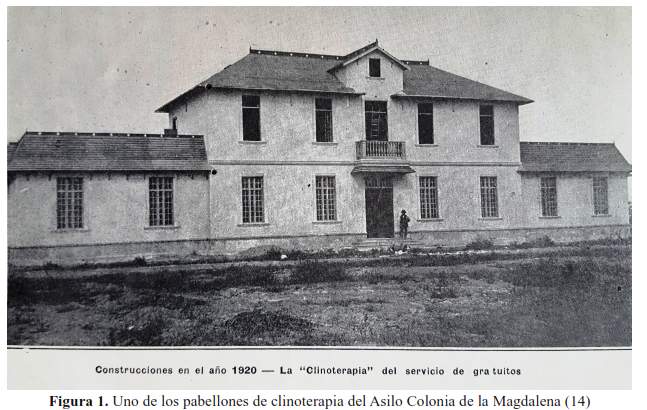 En el Perú, el Asilo Colonia de la Magdalena (actual Hospital Víctor Larco Herrera), inaugurado en 1918, contó tempranamente con pabellones de clinoterapia (ver la figura 1) (14). En 1937, Baltazar Caravedo consideró al reposo en el lecho como uno de los tres pilares de la evolución de la atención de los alienados, junto al open-door y el non restraint, en contraste con los “métodos de contención mecánica”, que “excitaban más a los alienados”, y “el sistema de clausura permanente”, que “los deprimía y los humillaba”. Además mencionó que para su aplicación en otras latitudes se diseñaban secciones especiales de observación y vigilancia continua, a cargo de enfermeros, en reemplazo del personal empírico (6). Es de notar que, inclusive en 1948, la Dirección del Hospital Víctor Larco Herrera solicitaba la construcción de “Una Clinoterapia para el mismo Servicio con capacidad de 50 camas” (15).