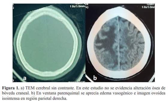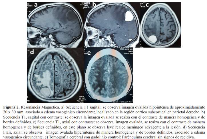 Paciente mujer de 59 años de edad, sin antecedentes de importancia. Inició cuadro 18 meses antes de ingreso caracterizado por deterioro cognitivo progresivo (trastornos en la codificación de la memoria episódica verbal y de la memoria retrógrada, juicio inadecuado, atención dispersa y trastornos en la articulación de las palabras), cefalea opresiva fronto parietal que se incrementó con el curso de los meses asociado a signos de focalización (hemiparesia izquierda leve) por lo que acude por emergencia; en la imagenología por tomografía se halló tumoración de la convexidad parietal derecha de 2x 3 cm (figura 1), se decide estabilizar a la paciente y hacer seguimiento de la lesión por consultorio; reingresando por emergencia seis meses después por caída de nivel, hemiparesia izquierda severa, asociado a náuseas; en el estudio laboratorial general que incluyó conteo y química sanguínea dentro de parámetros normales, radiografía torácica que no mostró anormalidades.