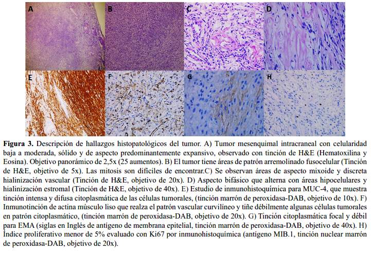 El examen microscópico de la lesión mostró una proliferación mesenquimal fusiforme, discreta a moderadamente celular con áreas de hialinización estromal y áreas laxas de aspecto mixoide en donde identificamos estructuras vasculares curvilíneas realzadas a la inmunotinción para CD34 y Actina músculo liso, que es expresada en escasas células tumorales. El EMA es expresado débil y focalmente. La inmunotinción para MUC-4 es intensa y difusamente positiva, y el índice proliferativo evaluado con ki67, es menor de 5%. Las mitosis son difíciles de encontrar. Las inmunotinciones para Beta Catenina, desmina, calponina, CD117, DOG1, receptor de progesterona, SOX 10, S100 y GFAP, son negativas (figura 3).