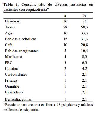 Para poder saber si nuestra observación acerca del mayor de consumo de gaseosas en pacientes con esquizofrenia era aislada, llevamos a cabo una encuesta en línea entre psiquiatras y residentes de psiquiatría(P/RP). La única pregunta que se realizó fue: “En su práctica médica en pacientes con esquizofrenia ¿ha recibido el reporte ya sea por parte de pacientes o de familiares/cuidadores un consumo alto de algunas de las siguientes sustancias?”. Además de gaseosas se pusieron como opciones: agua, café, té, bebidas alcohólicas, bebidas energizantes, tabaco u otras. Los resultados se muestran en la tabla 1.