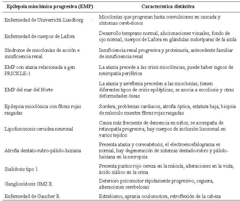 En el presente artículo se hará una revisión de las formas de epilepsia mioclónica progresiva más frecuentes. En la tabla 1 se puede apreciar un resumen de algunas características distintivas de cada enfermedad discutida a continuación.