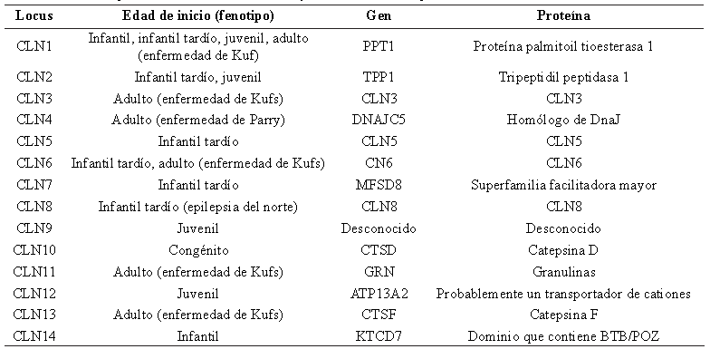 Genética: Se conocen más de 400 variantes en 14 loci diferentes (CLN1 al 14) en humanos. Suelen tener herencia autosómica recesiva, aunque se han descrito formas autosómico dominantes en los fenotipos de aparición tardía. La lista de loci y genes identificados por fenotipo se resumen en la tabla 1 (1,2,4).