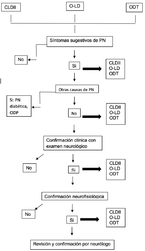CLDII: administración continua de levodopa por infusión intestinal, O-LD: levodopa oral,ODT: otra terapia dopaminérgica, PN: neuropatía periférica, PDIC: enfermedad desmielinizante inflamatoria crónica.