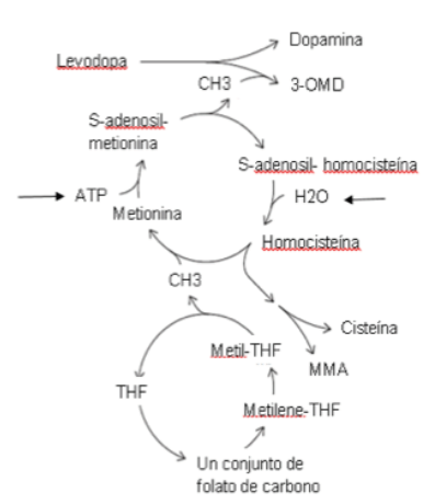 Conversión de levodopa en 3-O-metildopa (3-OMD) agota las reservas de grupos metilo (CH3) y conduce a producción de homocisteína. Re-metilación de homocisteína posterior (en metionina) requiere vitamina B12 (cobalamina) como cofactor y obtiene su CH3 del conjunto de folato de carbono. Implicación del metilentetrahidrofolato (metileno-THF) en el suministro del CH3 hace que el polimorfismo en la reductasa de metileno-THF sea importante determinante del nivel de homocisteína en plasma. Transulfuración de homocisteína (en cisteína) requiere vitamina B6 (piridoxina). Una ruta que conduce al ácido metilmalónico (MMA) hace que tanto la MMA como la homocisteína sean marcadores del déficit funcional de la vitamina B12. ATP = trifosfato de adenosina.