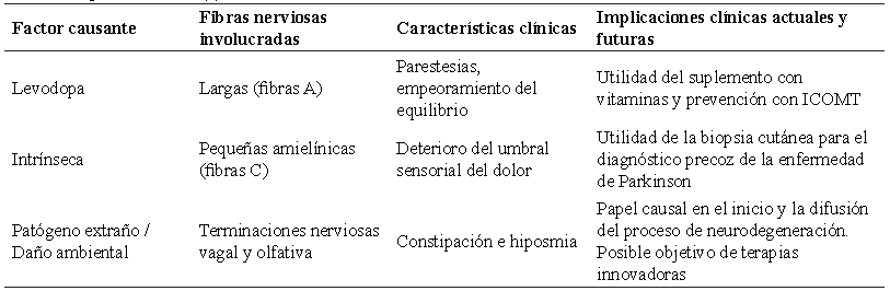 El estudio y manejo terapeutico del compromiso del nervio periférico en pacientes con EP es relativamente reciente y continúa siendo muy controvertido. La fisiopatología subyacente es tema de grandes debates, su etiología y pronóstico, son temas poco dilucidados, entenderlos nos podría llevar a comprender la ansiada fisiopatología de la enfermedad de Parkinson revelándonos gran parte de los misterios que aún enmarca. La Levodopa vía oral o en infusión en gel de levodopa/carbidopa están asociadas a polineuropatía por disminuir las vitaminas B6, B12, folatos, y/o por aumentar la homocisteína y alterar la absorción y metabolismo de levodopa.